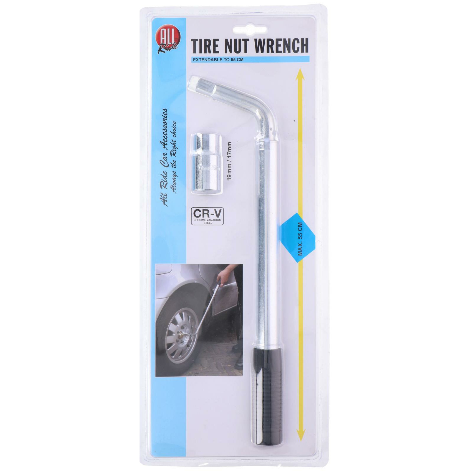 Auto wielmoersleutel telescopisch/uitschuifbaar van 40 tot 51 cm met doppen 17-19 mm. Met deze wielmoersleutel draait u makkelijker autobanden/autowielen los. Wordt geleverd met 1 dopsleutel, maat 17-19 mm. Materiaal: metaal, handvat rubber.