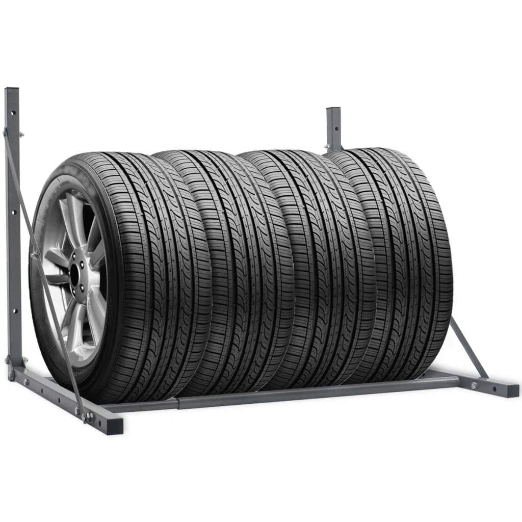 Dit inklapbare bandenrek is de perfecte oplossing voor het bewaren van banden in je garage of op je werkplaats. Het is ideaal voor het bewaren van seizoensbanden, camperbanden, ATV banden en meer. Dit wandgemonteerde bandenrek is gemaakt van sterke, duurzame stalen buizen en heeft een draagvermogen tot 136 kg. De breedte is verstelbaar tussen 81 en 122 cm, waardoor het rek makkelijk ruimte biedt aan ten minste 4 standaard autobanden. Dit bandenrek kan snel aan de wand worden gemonteerd, en platgeklapt worden tegen de muur, wanneer hij niet wordt gebruikt. Hij kan ook gebruikt worden om fietsen en andere spullen op te slaan.