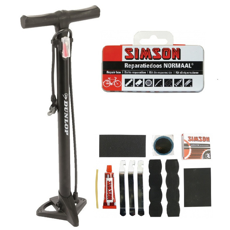 Fietsaccessoires banden oppompen fietspompen. , Dit artikel bestaat uit:, 1x Simson fietsband reparatieset – bandenplaksetje, 1x Dunlop Fietspomp – met extra verloopnippels – ventielen – 63 cm