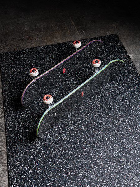Wat gebeurt er met versleten schoenen en autobanden aan het einde van hun levenscyclus? In de meeste gevallen komen ze op een stortplaats terecht, gaan nooit echt kapot en zijn bestemd om millennia lang op een hoop op deze aarde te blijven liggen. In dit geval… worden ze een milieuvriendelijkere benadering van griptape en EVA-schuim. Uitgelicht als vervanging voor nieuwe materialen en prominent op kinderborden om ze aan het denken te zetten over wat er met dingen gebeurt als we ze al vroeg gebruiken.