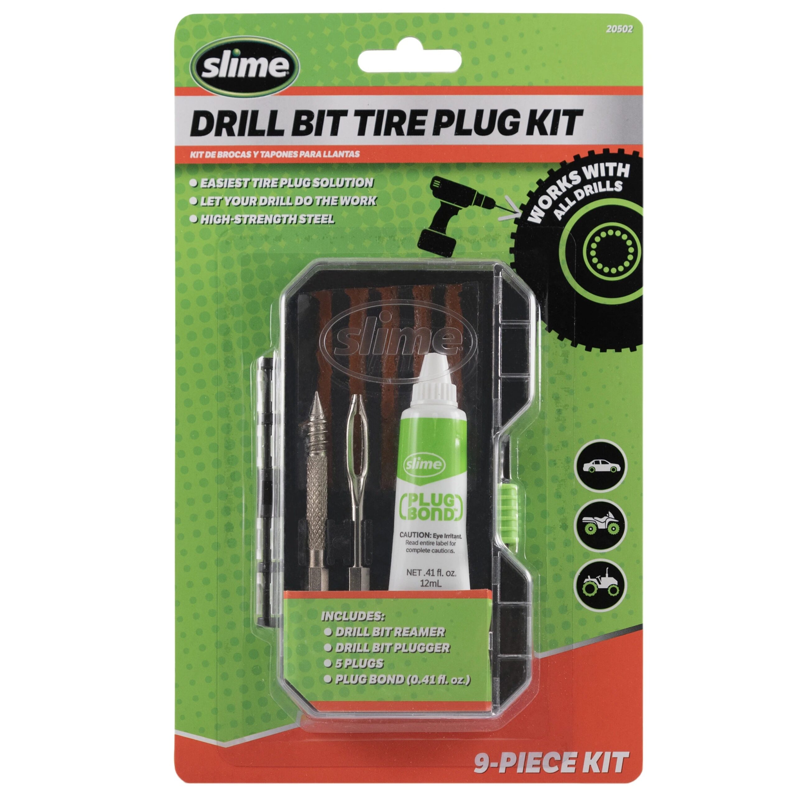 Deze 9-delige Slime set voor boormachines is de meest eenvoudige manier om een lekke band te repareren. Doordat de boormachine het werk verricht, is fysieke inspanning overbodig. De set bevat een ruimerboor en een plugboor die passend zijn op alle standaard boormachines. Bovendien hoeft de band tijdens de reparatie niet van het voertuig te worden verwijderd. Geschikt voor auto's, vrachtwagens, quads, kruiwagens, grasmaaiers en andere binnenbandloze off-roadbanden. De set bestaat uit: