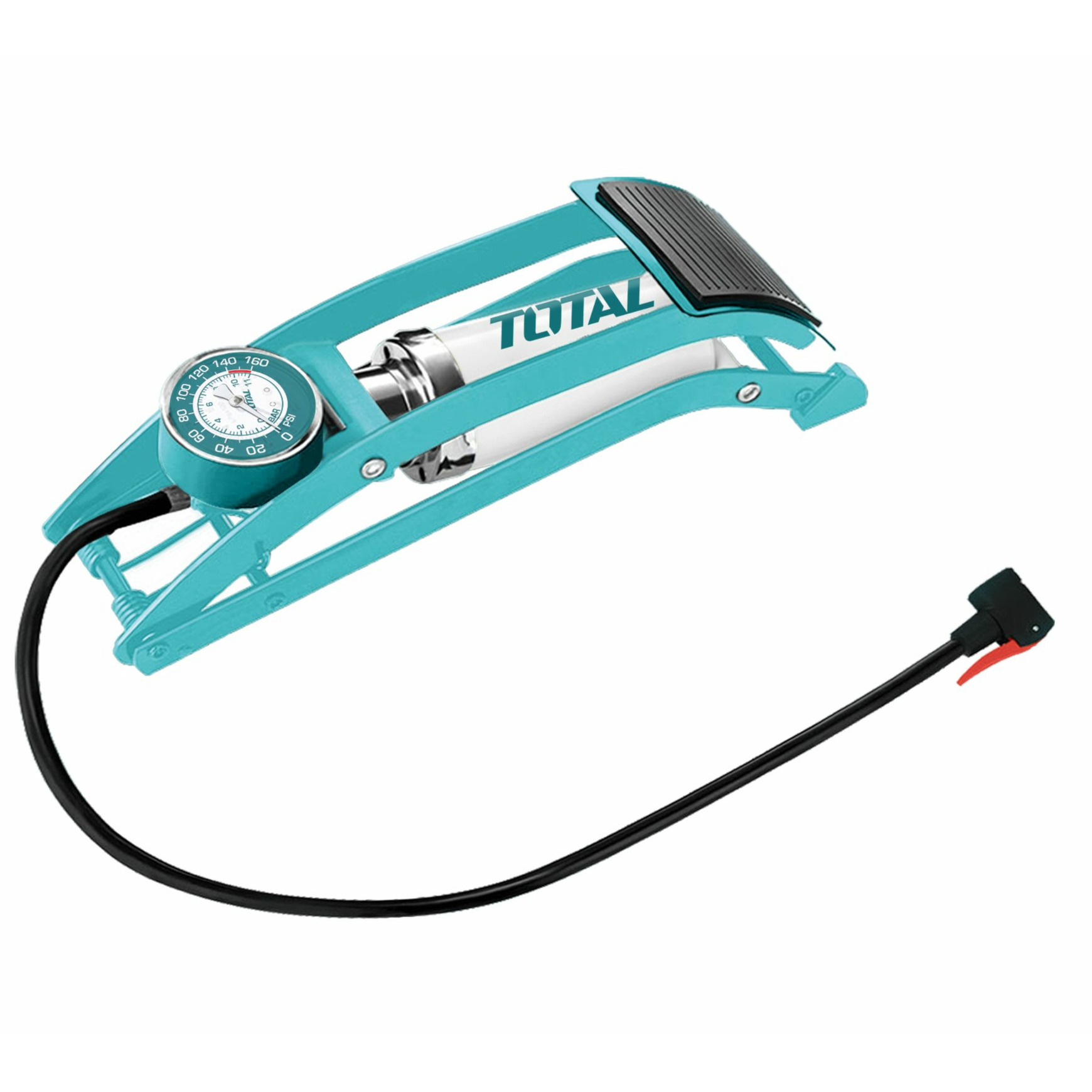 Fietspomp met voet bediening en een ventielkop voor alle gangbare ventielen. De voetpomp heeft een stevige cilinder van metaal, rubber vlak op het pedaal en is geschikt voor fietsen, scooters, brommers, motoren en autobanden. Maximale druk is 150 PSI/9.6 Bar. De slang is 60 cm.